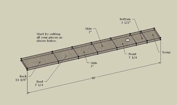 | When you have finished cutting all your pieces. You will then be ready to start drilling the entry and pilot holes. With a 1/8 drill bit per drill the front,back and roof of your house. Next mark and drill the entry hole using a 1 3/8 hole saw bit. |